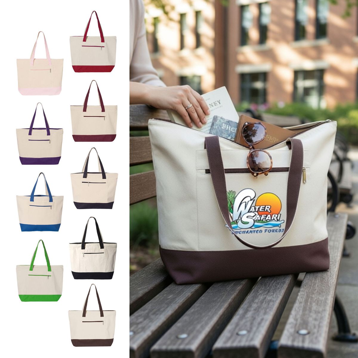 The reusable and eco-friendly 12 oz. canvas tote comes with a large secured main compartment with zipper closure to keep your important belongings safe without easily falling out. It also includes a smaller front zipper pocket for added space, organization and quick access. The tote is comfortable to carry as it offers 24 1/2" self-fabric handles with a 8 1/2" handle drop. The 100% cotton canvas allows for high durability and not much maintenance involved as it is machine wash friendly. Moreover, the benefit of the material is that It doesn't have weird odors and static shocks aren't an Issue. Canvas cotton is strong, tough, resistant to pilling, easy to clean and rarely requires ironing. An all purpose bag that everyone will love and use often. Great for events and groups.