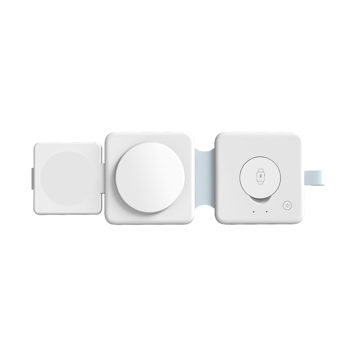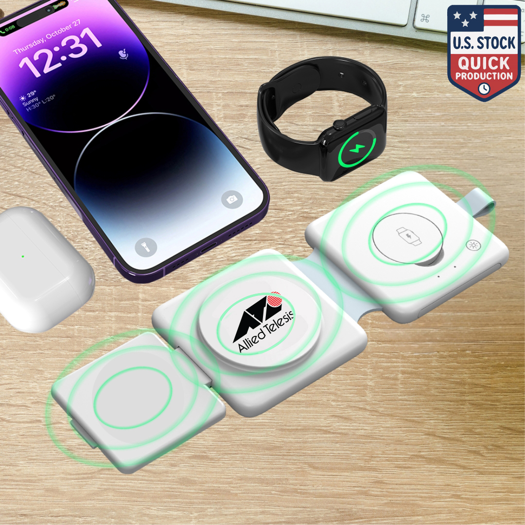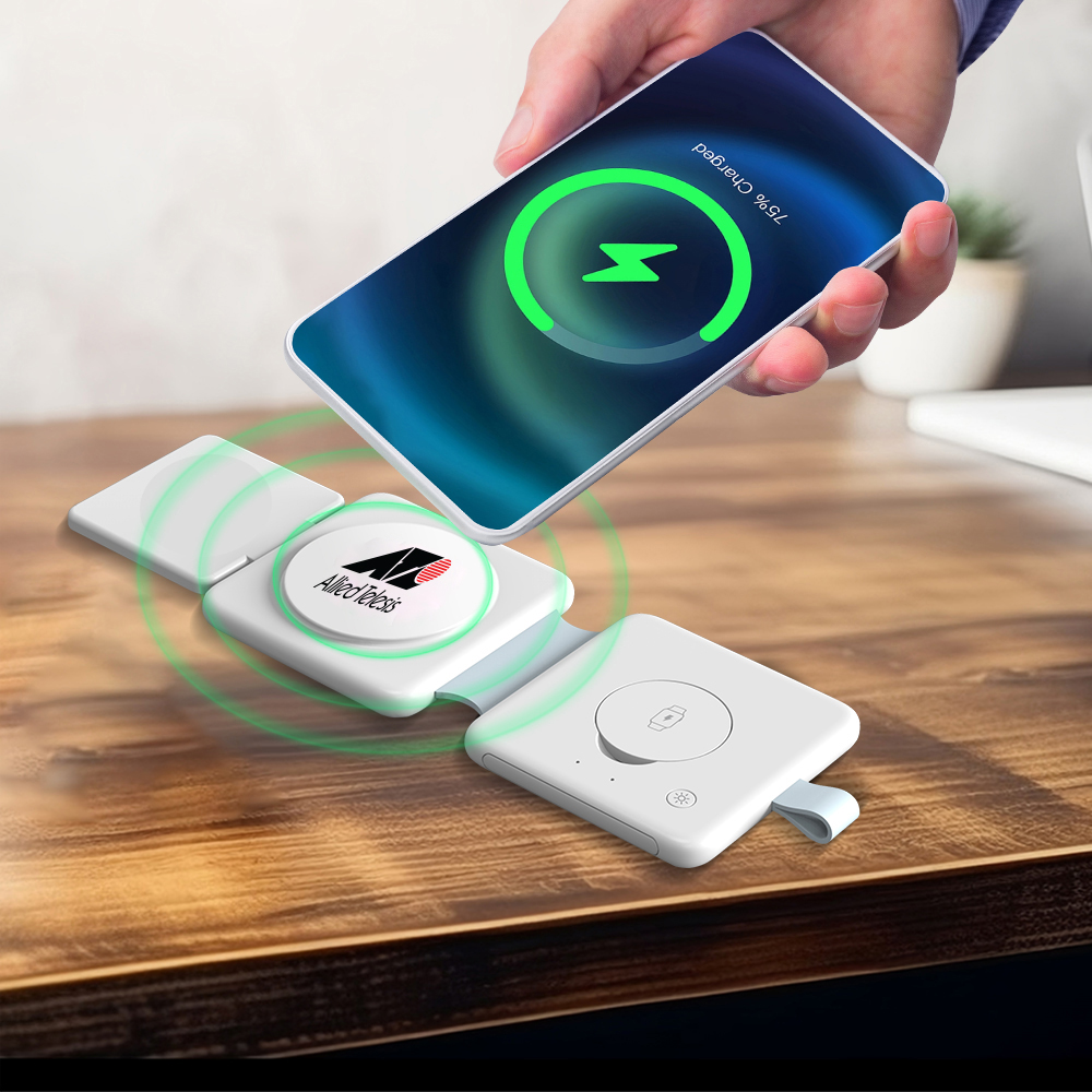 The 3-in-1 MagSafe Foldable Wireless Charger is the perfect solution for charging multiple devices in one sleek, portable package. This compact charger powers up your phone, earbuds, and smartwatch simultaneously using MagSafe technology for optimal alignment and fast charging. Its foldable design ensures easy storage and portability, while the built-in night light adds a touch of ambiance. Made from durable ABS material, it also offers customization options, making it ideal for personal or corporate use. Weight: 3.88 oz. Accessory: Charging Cable.