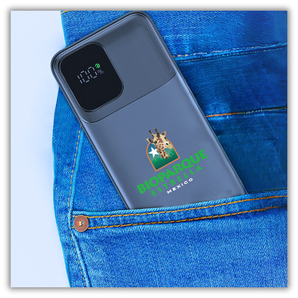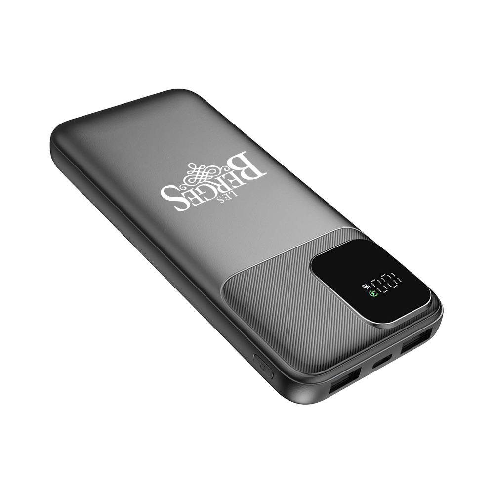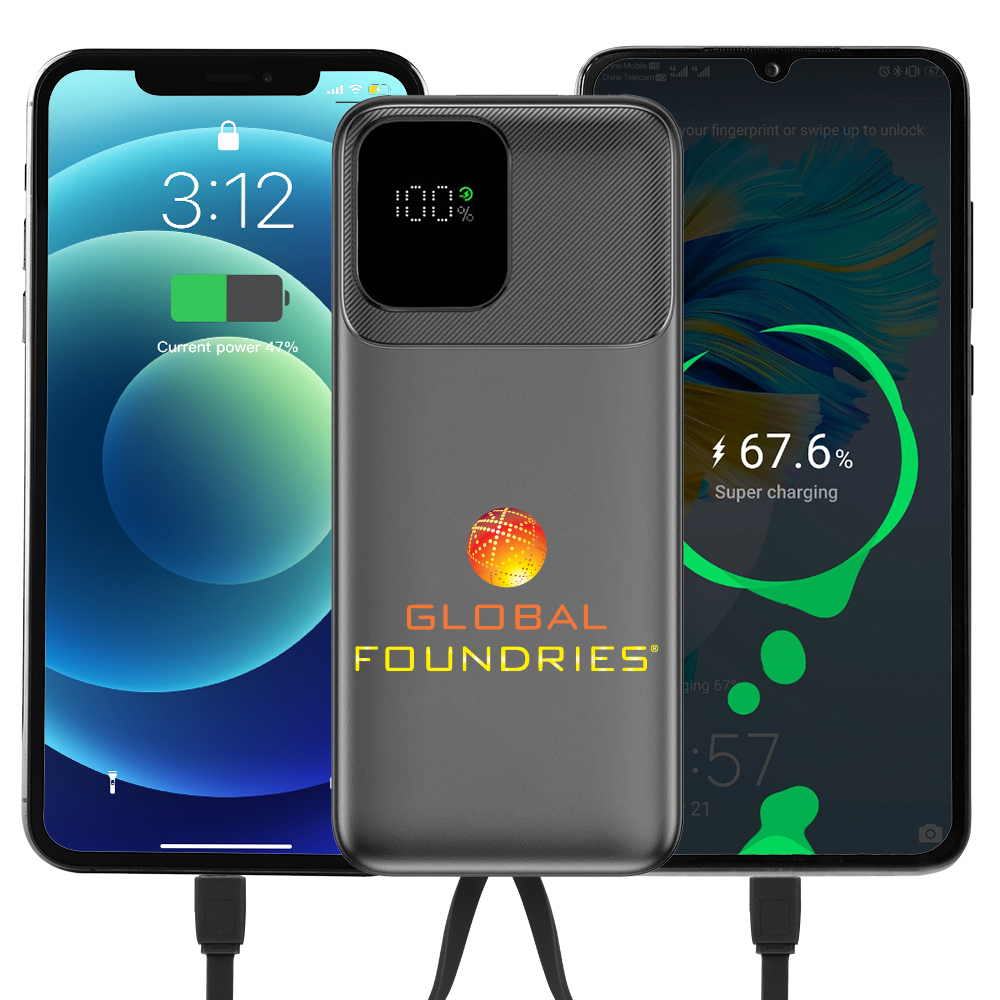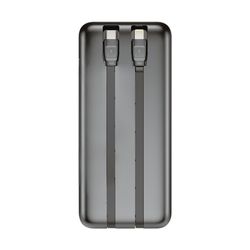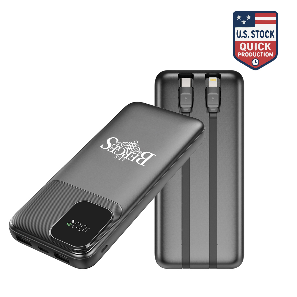 The Dual Cord Power Bank offers ultimate convenience with integrated Lightning and Type-C cables, allowing you to charge multiple devices without extra cords. Its 10,000mAh capacity ensures reliable power all day, while the clear digital display lets you track remaining charge. With two USB ports and built-in cables, it can charge up to four devices simultaneously. Compact and sleek, it also serves as a perfect promotional item with ample space for logo customization. Weight: 8.29 oz, Accessory: Type C charging cable.
